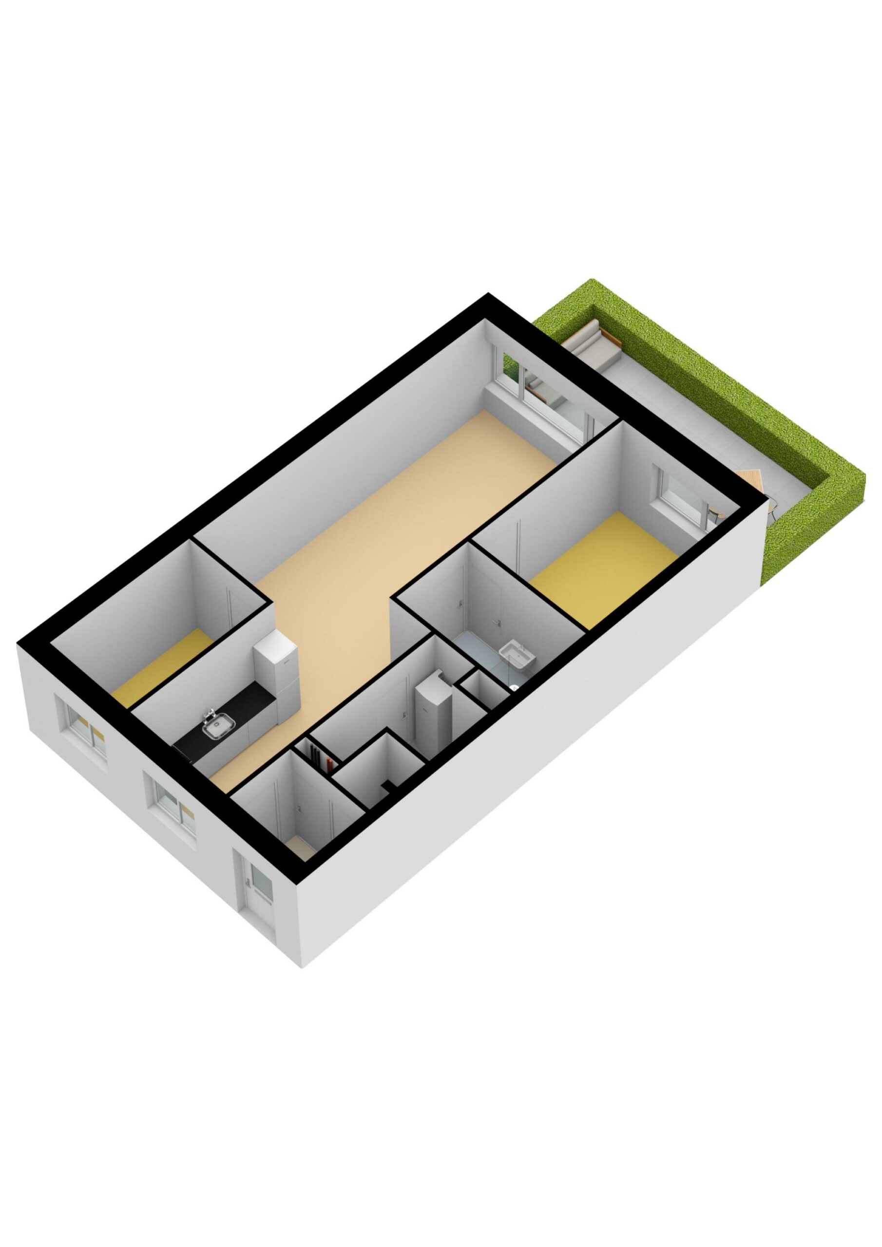 Dit appartement is gelegen op de begane grond en heeft een ruime woonkamer, open keuken met diverse inbouwapparatuur, 2 slaapkamers, toilet, badkamer en bergruimte/technische ruimte.