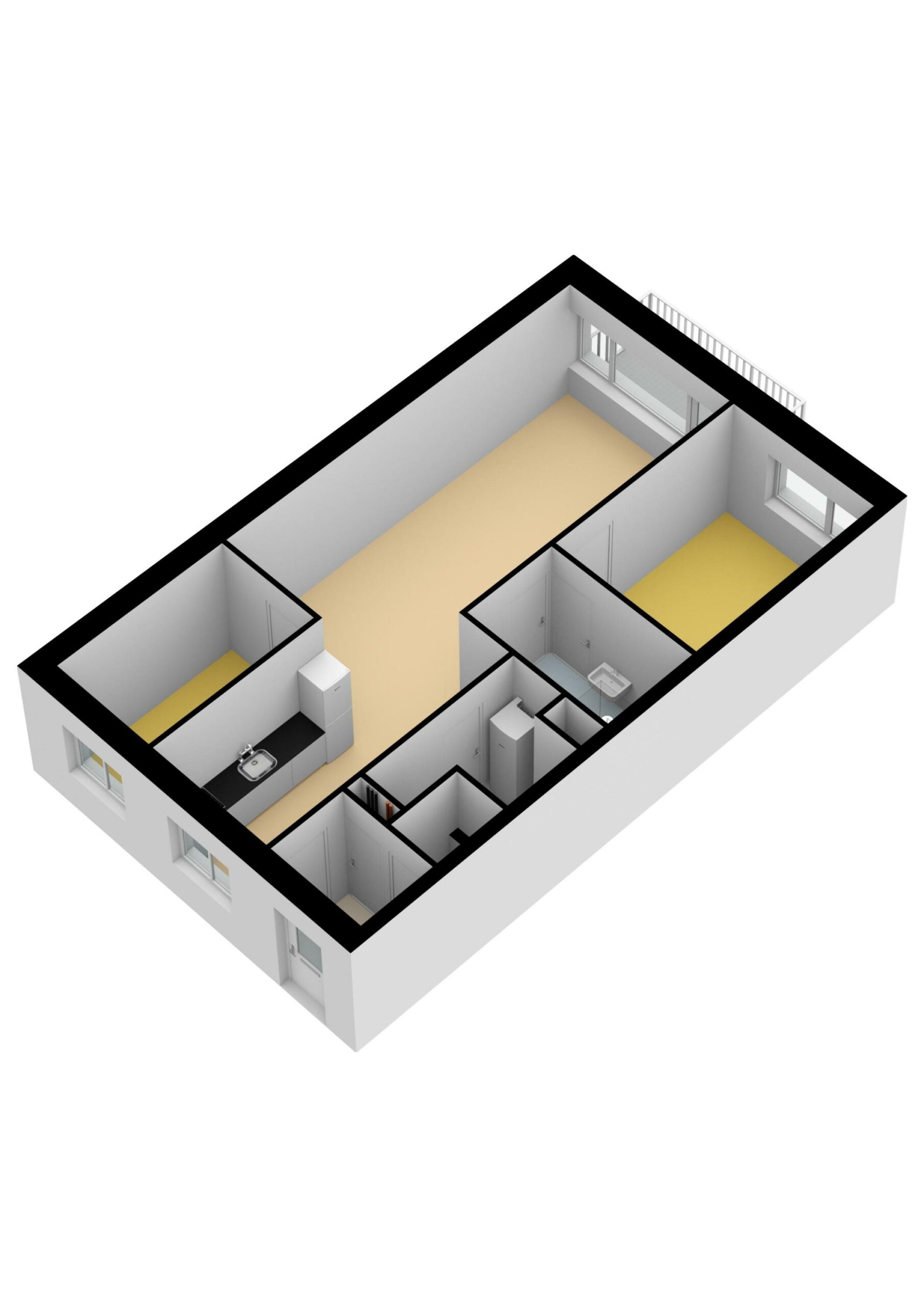 Dit appartement is gelegen op de eerste verdieping en heeft een ruime woonkamer, open keuken met diverse inbouwapparatuur, 2 slaapkamers, toilet, badkamer en bergruimte/technische ruimte.