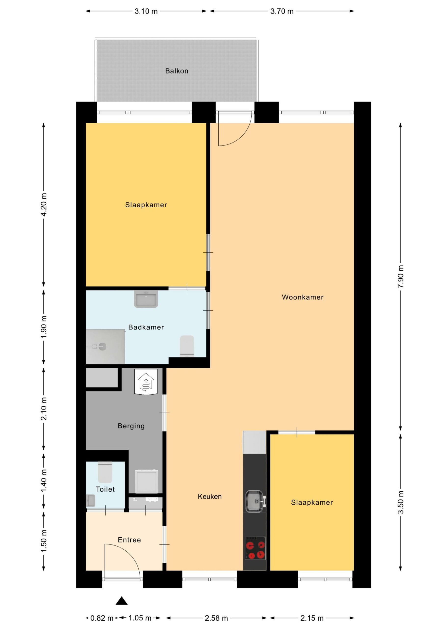 Dit appartement is gelegen op de eerste verdieping en heeft een ruime woonkamer, open keuken met diverse inbouwapparatuur, 2 slaapkamers, toilet, badkamer en bergruimte/technische ruimte.