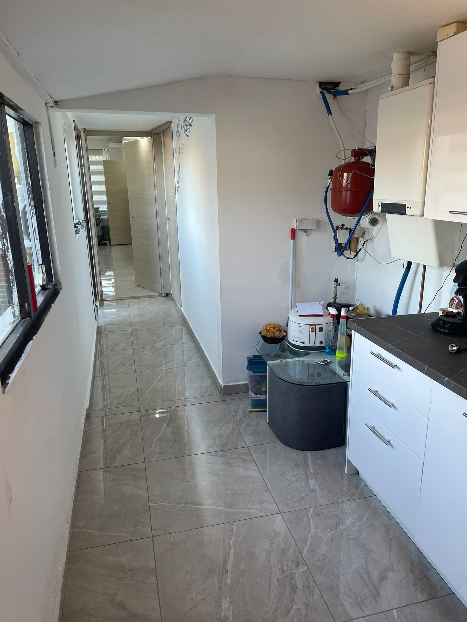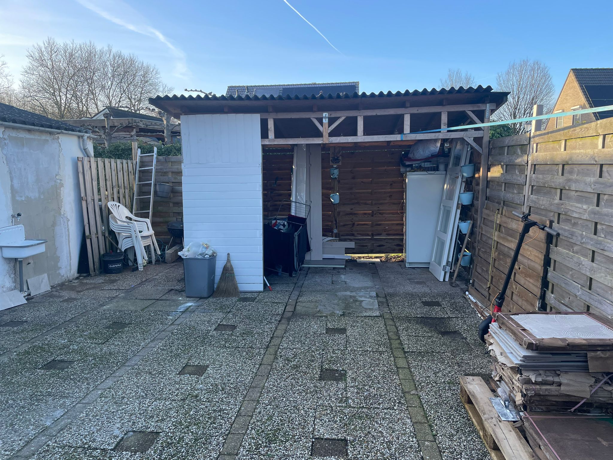 hal met meterkast (7 groepen) , trapkast met boiler (120 liter), woonkamer met stenen vloer, keuken met deur naar tuin. Aangebouwde berging met cv ketel (Intergas).