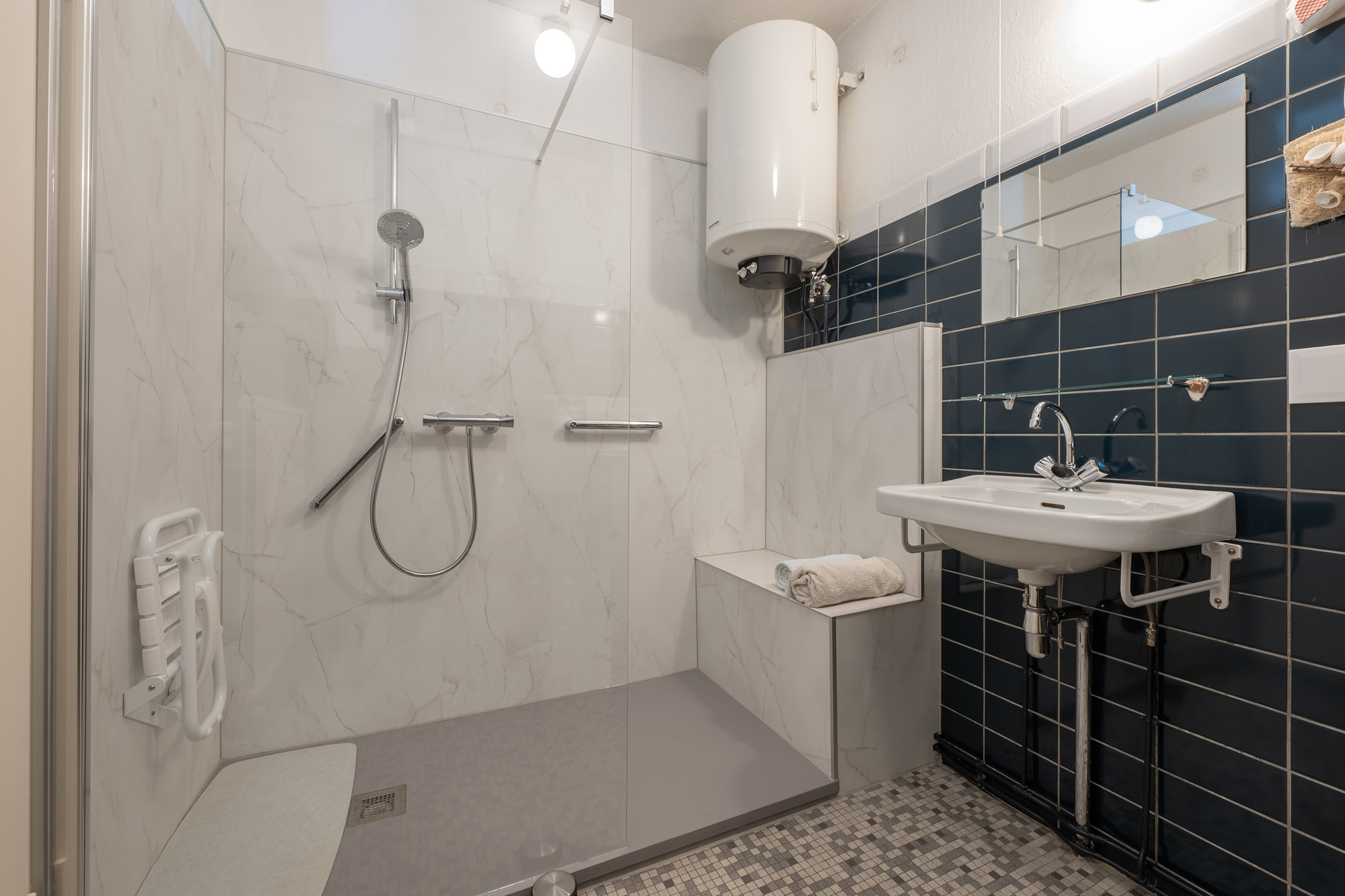 • Badkamer met inloopdouche (uitgerust met een opklapbaar douchestoeltje en handgreep, vernieuwd in voorjaar 2025), dubbele wastafel,