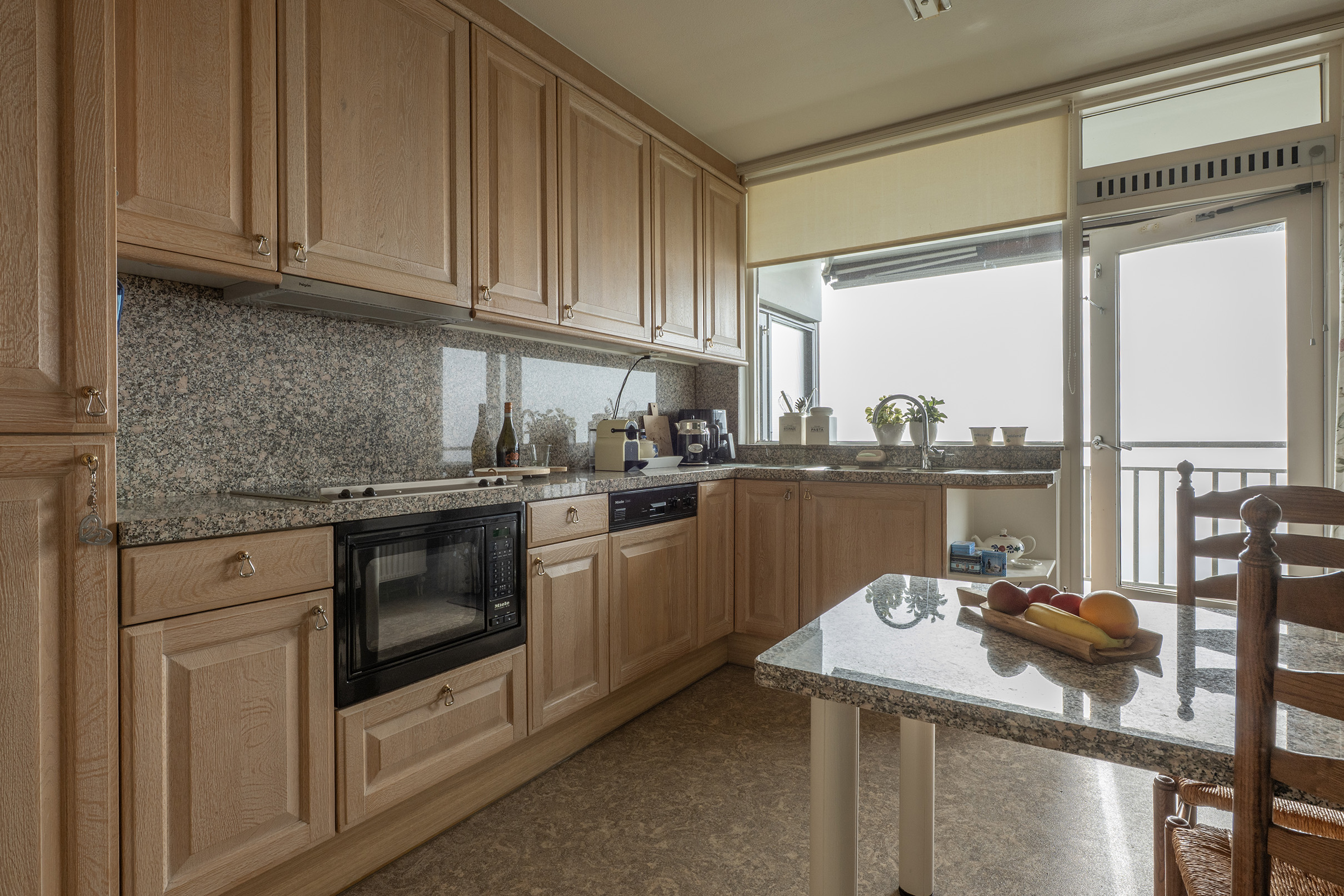 • Gesloten keuken, uitgevoerd in ‘wild eiken’ met een marmeren blad en inbouwapparatuur van