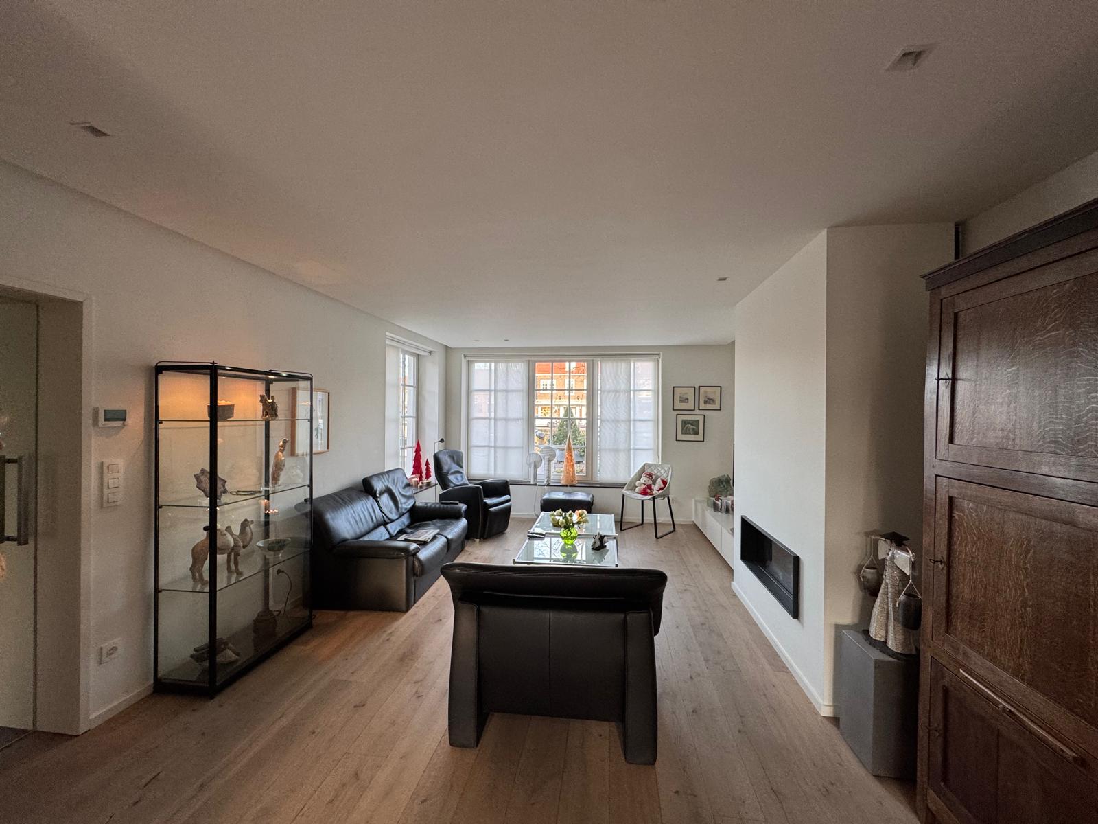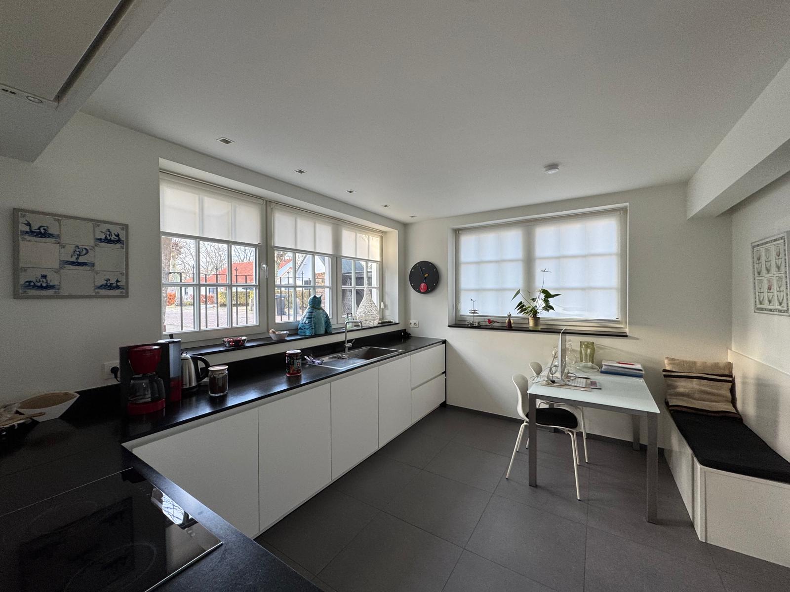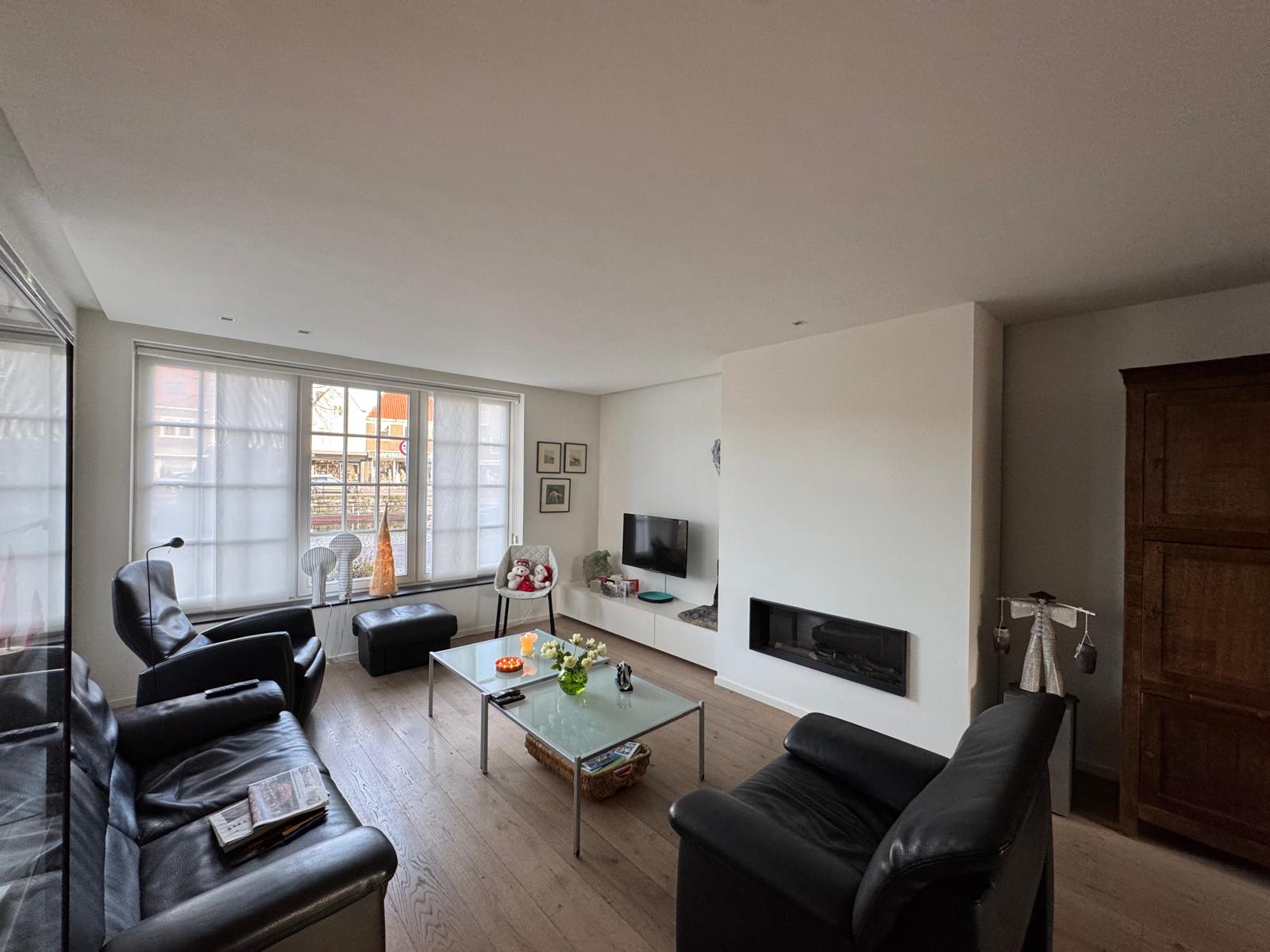 De ruime woonkamer beschikt over een sfeerhaard op gas regelbaar in 15 stappen, een massif houten parketvloer met vloerverwarming. Via het aaneengesloten eetgedeelte loopt u door naar de tuin. De lichtkoepel in de woonkamer en de openslaande deuren naar de tuin zorgen voor veel lichtinval en een directe verbinding met buiten. Vanuit de woonkamer heeft u een mooi uitzicht over de Kaai van Sluis.