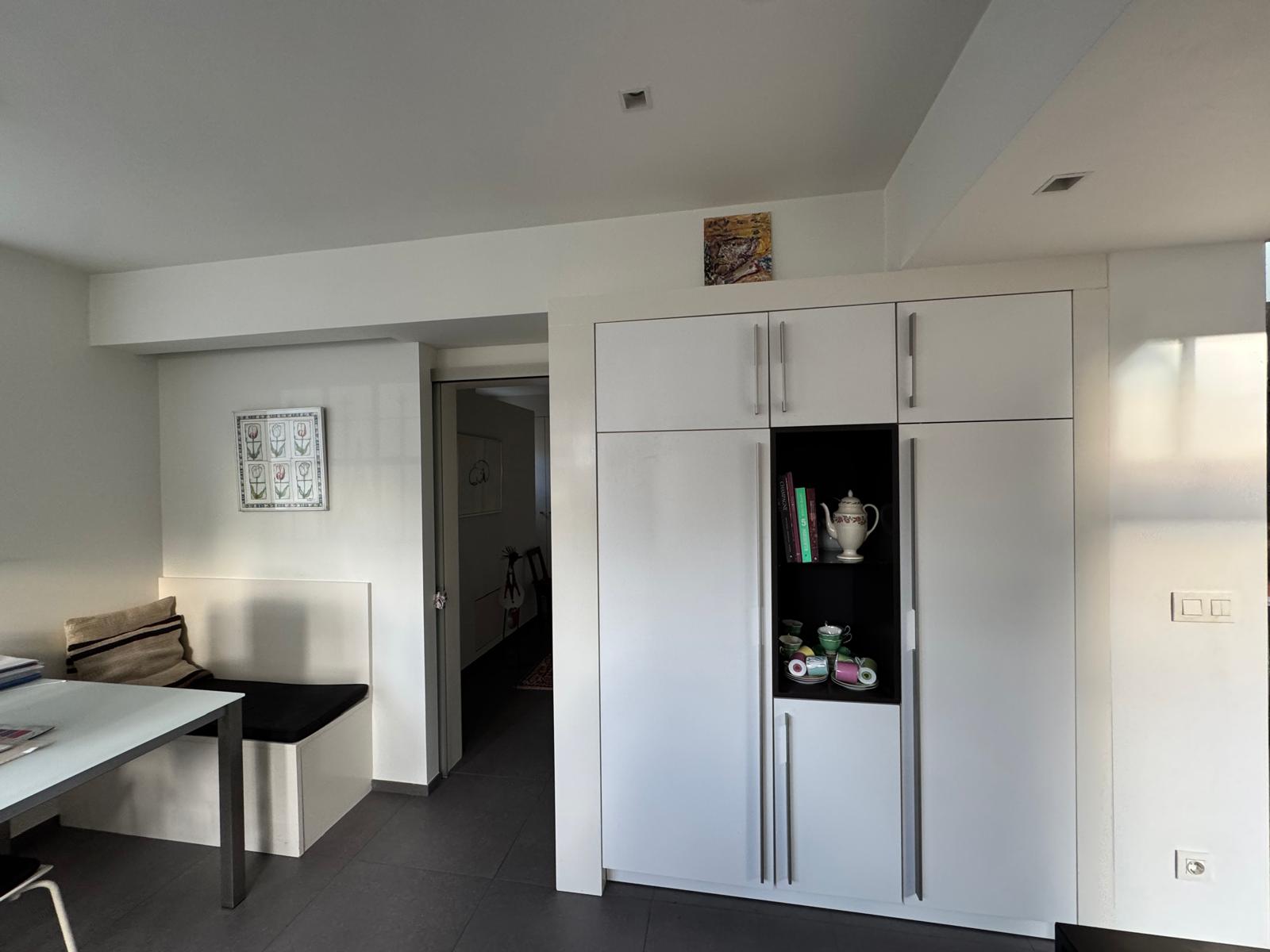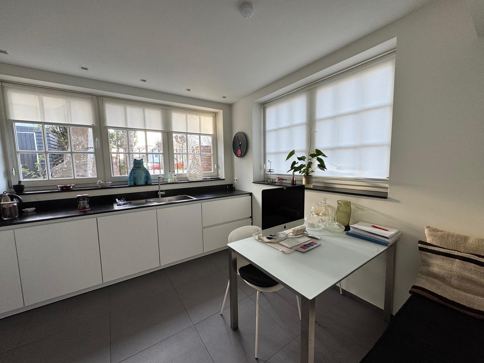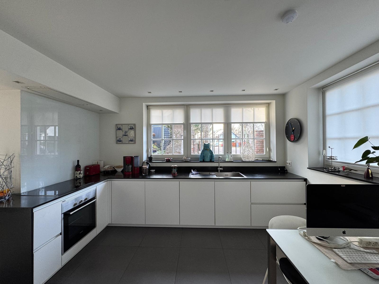 De moderne SieMatic keuken is voorzien van keramische kookplaten, een afzuigkap geïntegreerd in het plafond, oven, hardstenen werkblad, vaste kasten en een plavuizen vloer met vloerverwarming.