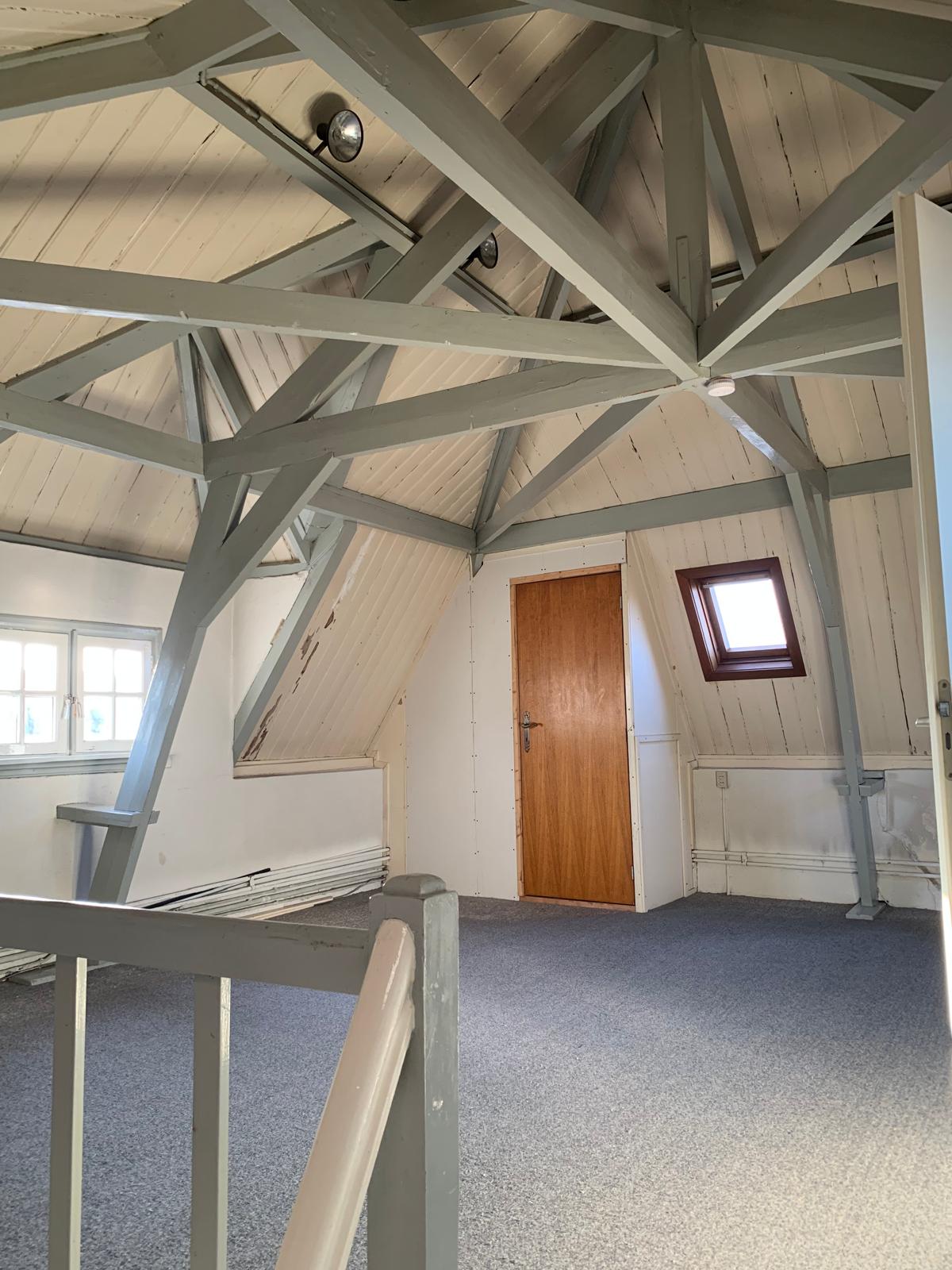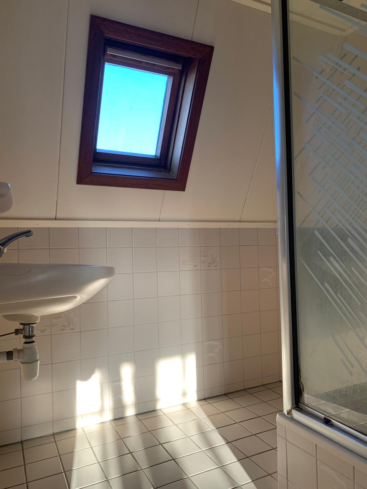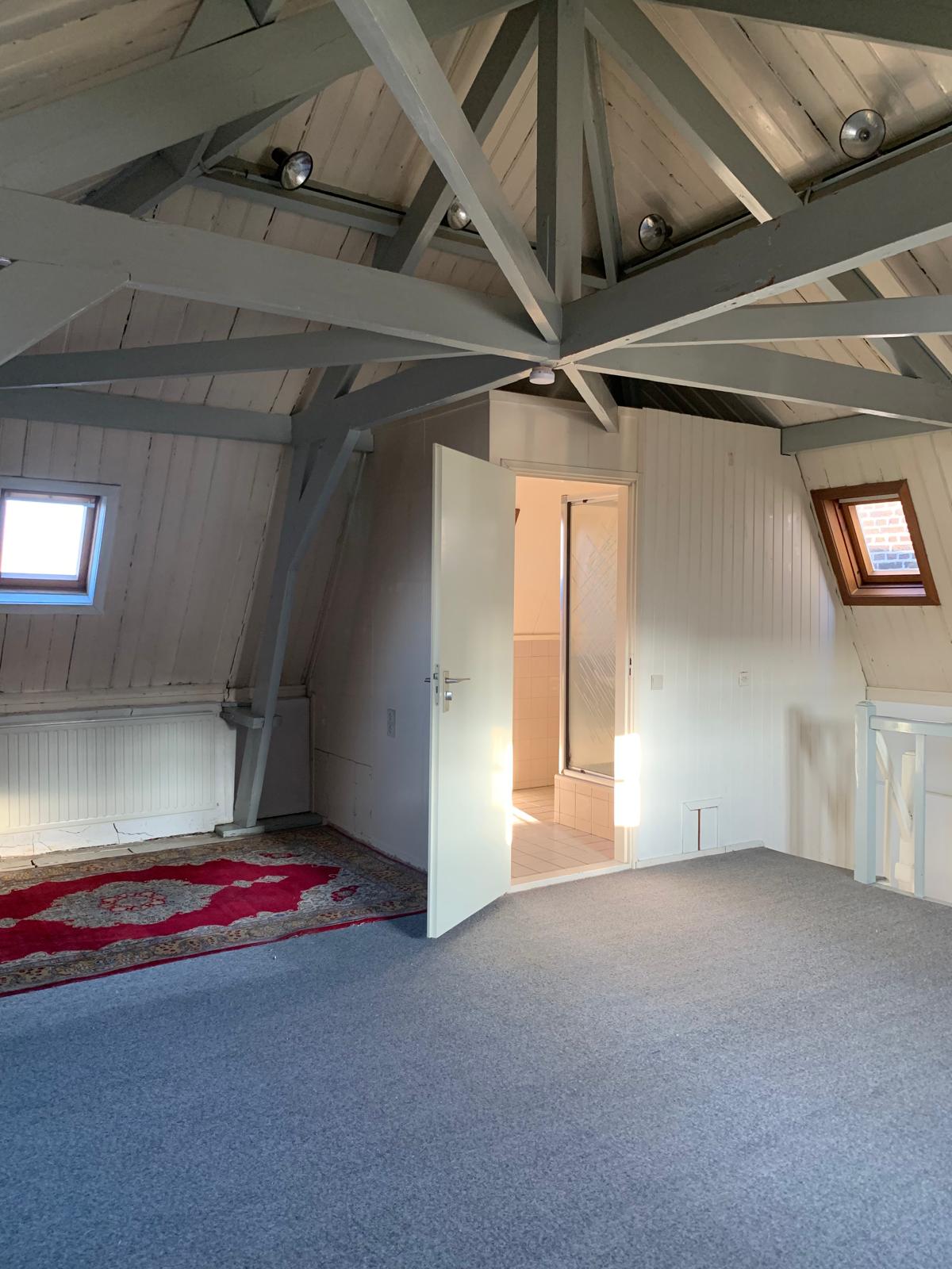 2e Verdieping: vaste trap, ruime kamer (ca. 34m²), badkamer met douche en wastafel.