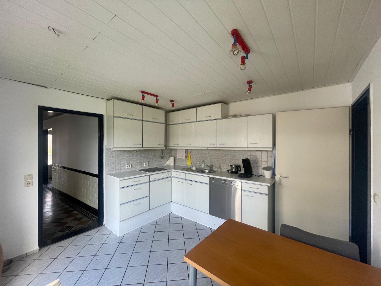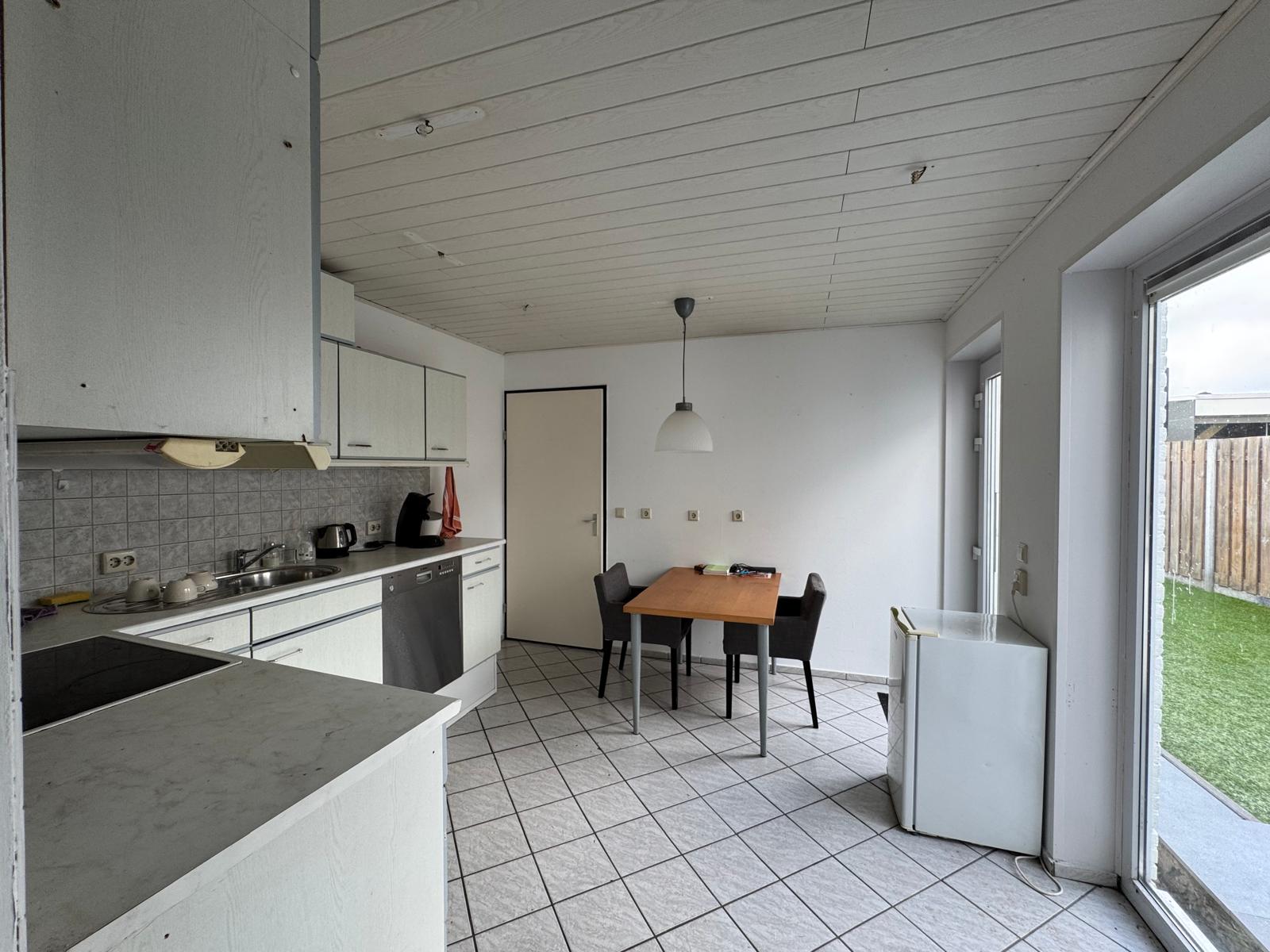 Ruime eetkeuken in een hoekopstelling met een eenvoudige keukeninrichting voorzien van een 4-pits keramische kookplaat en een afzuigkap. Via de keuken is er toegang tot de tuin.