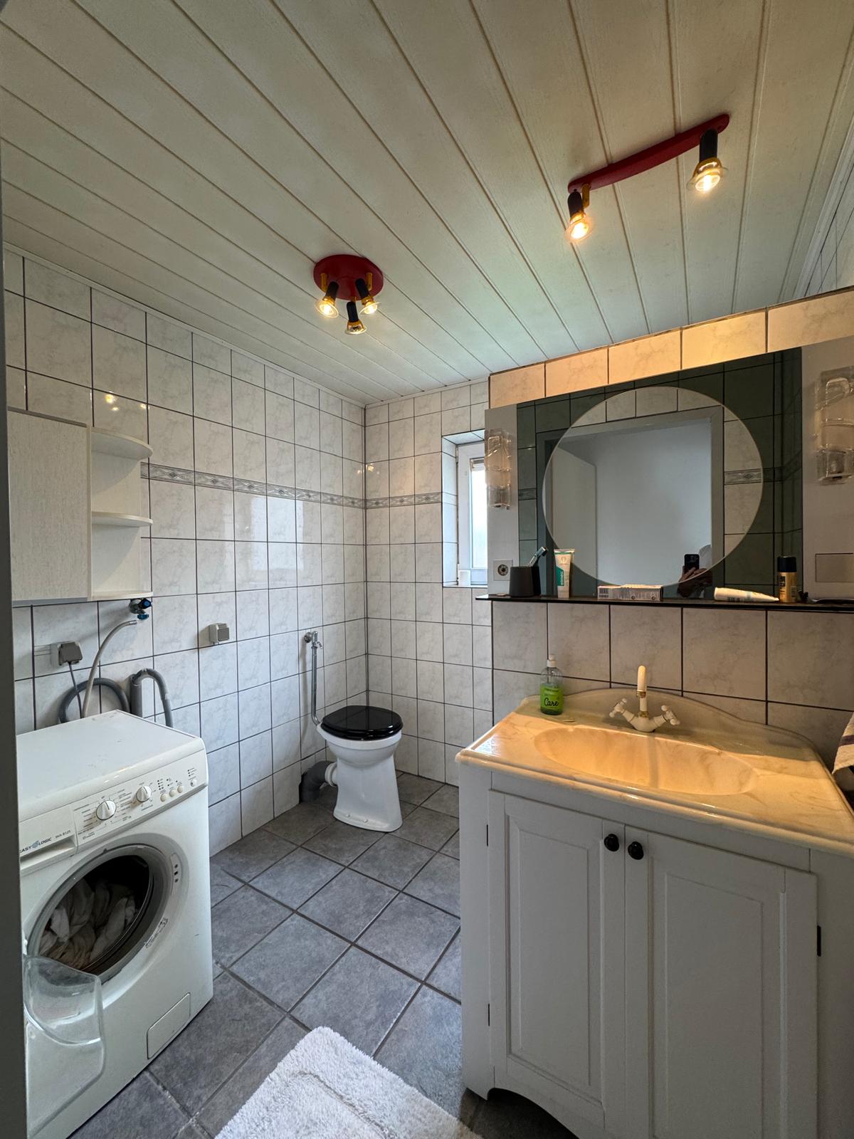 Aansluitend aan de keuken is een badkamer. Deze is voorzien van een douche, wasmeubel, toilet en aansluiting voor de wasapparatuur.