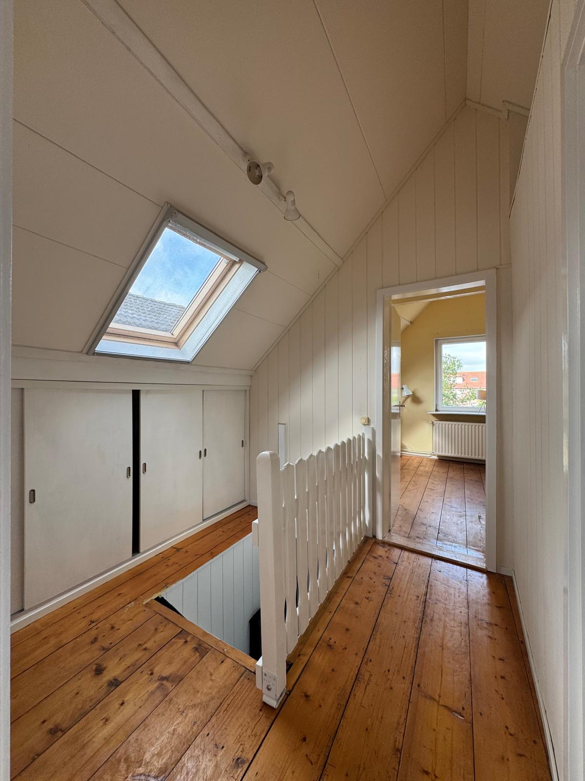 Overloop met houten vloer. Alle ruimtes op de eerste verdieping zijn o.m. voorzien van Velux dakramen. De overloop heeft veel bergkasten onder de schuine kanten.