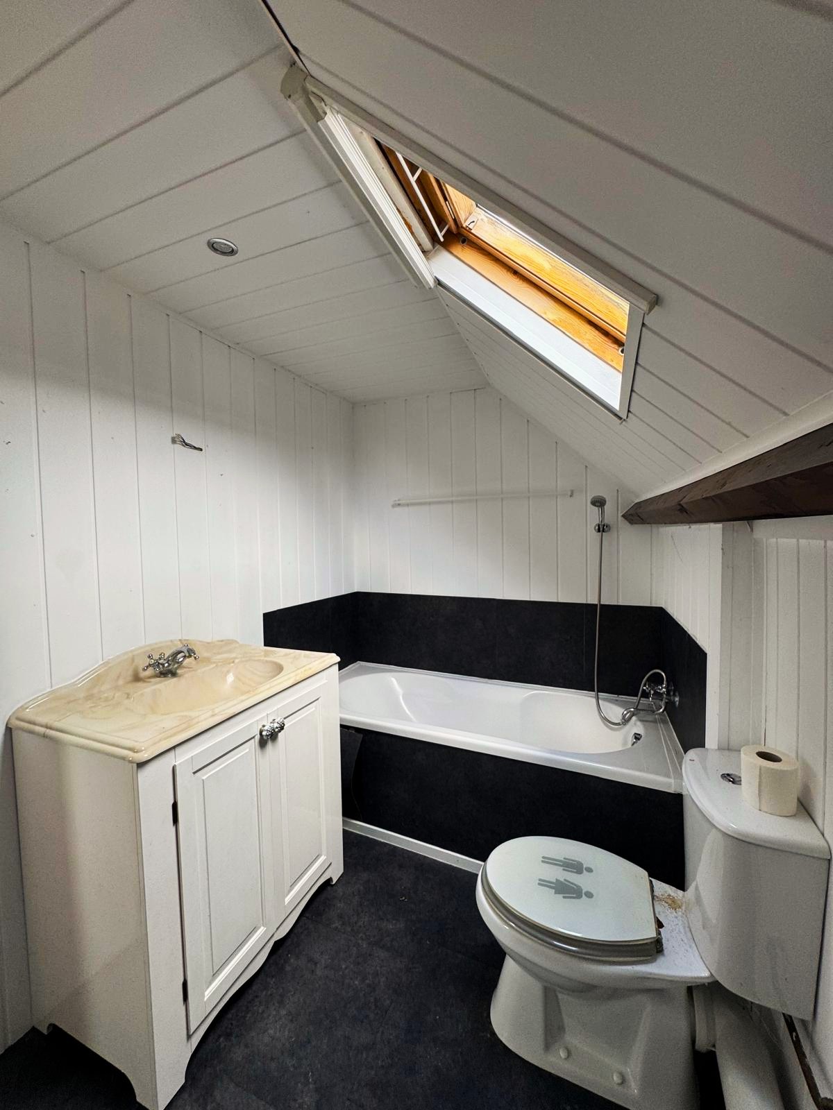 De badkamer is voorzien van een ligbad, wasmeubel en een tweede toilet.