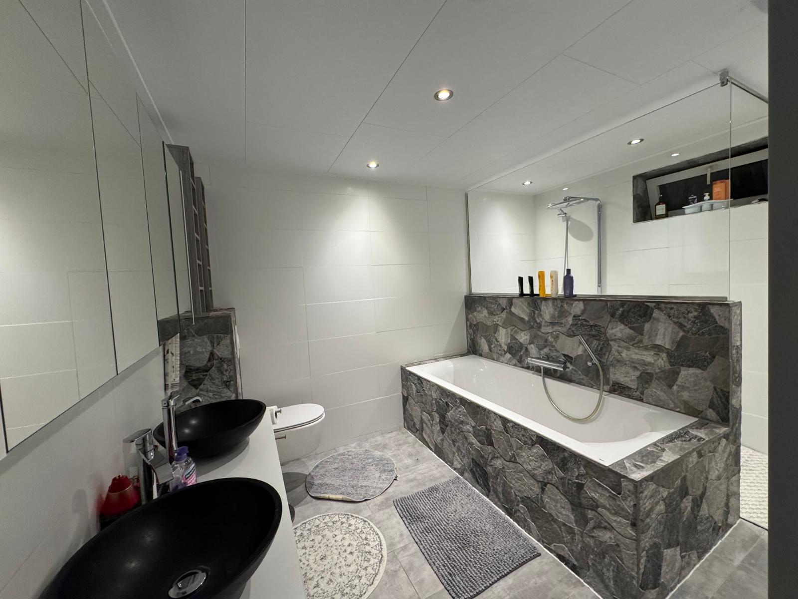 – Ruime badkamer met ligbad, inloopdouche, dubbele wastafel met meubel en toilet (2020).