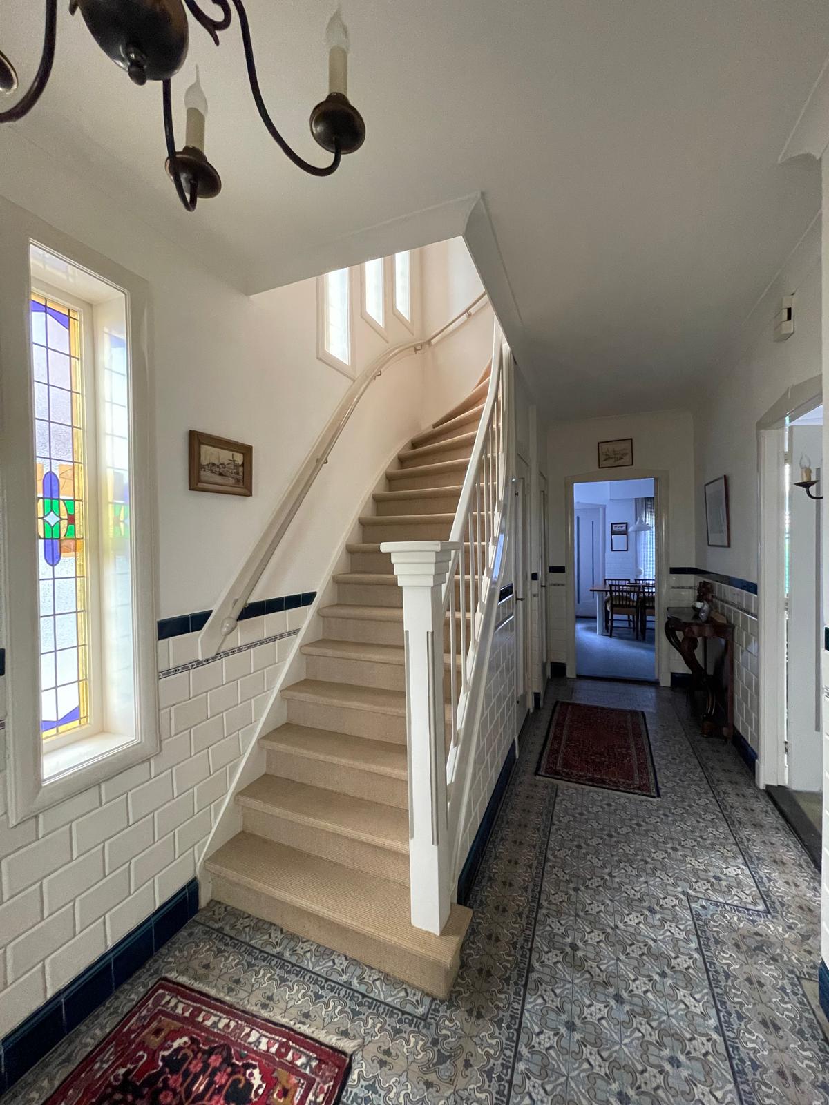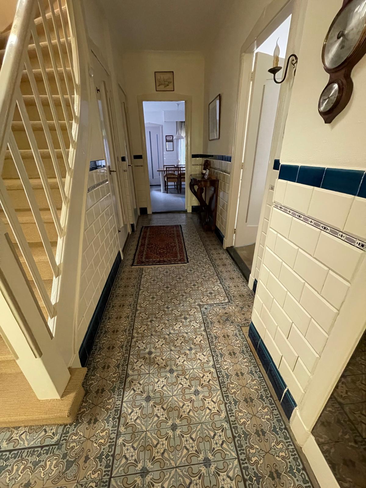 entree/ tochtportaal, gang met originele tegelvloer, vernieuwde meterkast, garderobe, toilet en trap naar de verdieping,