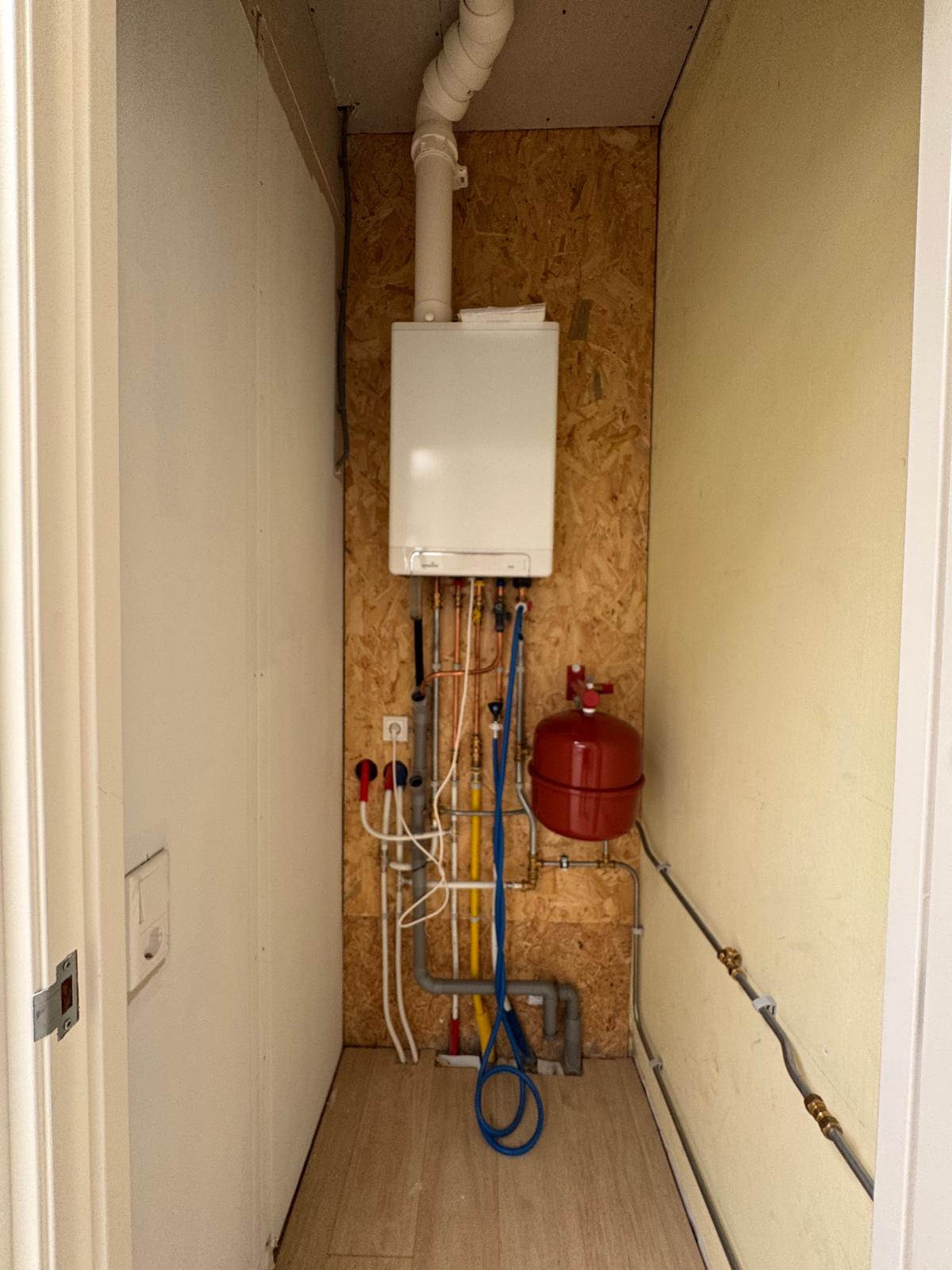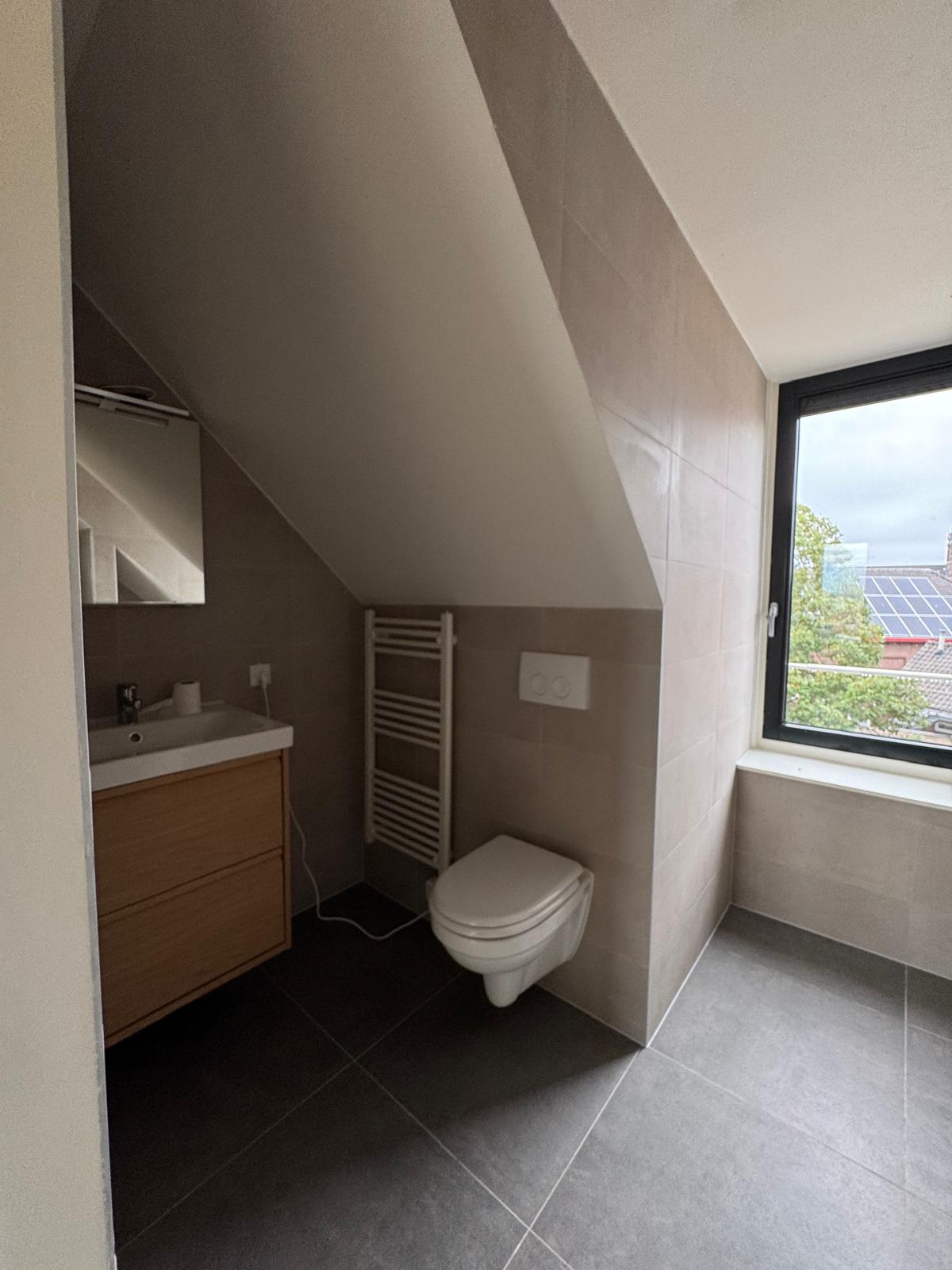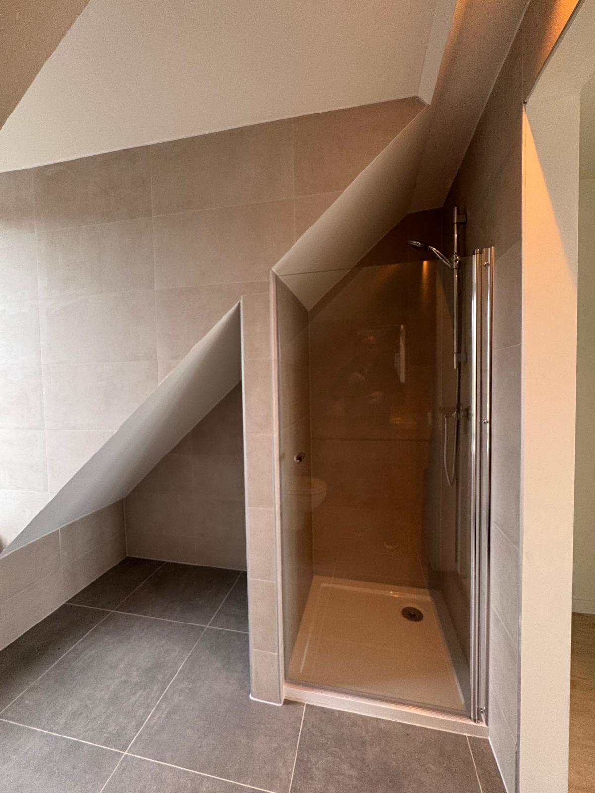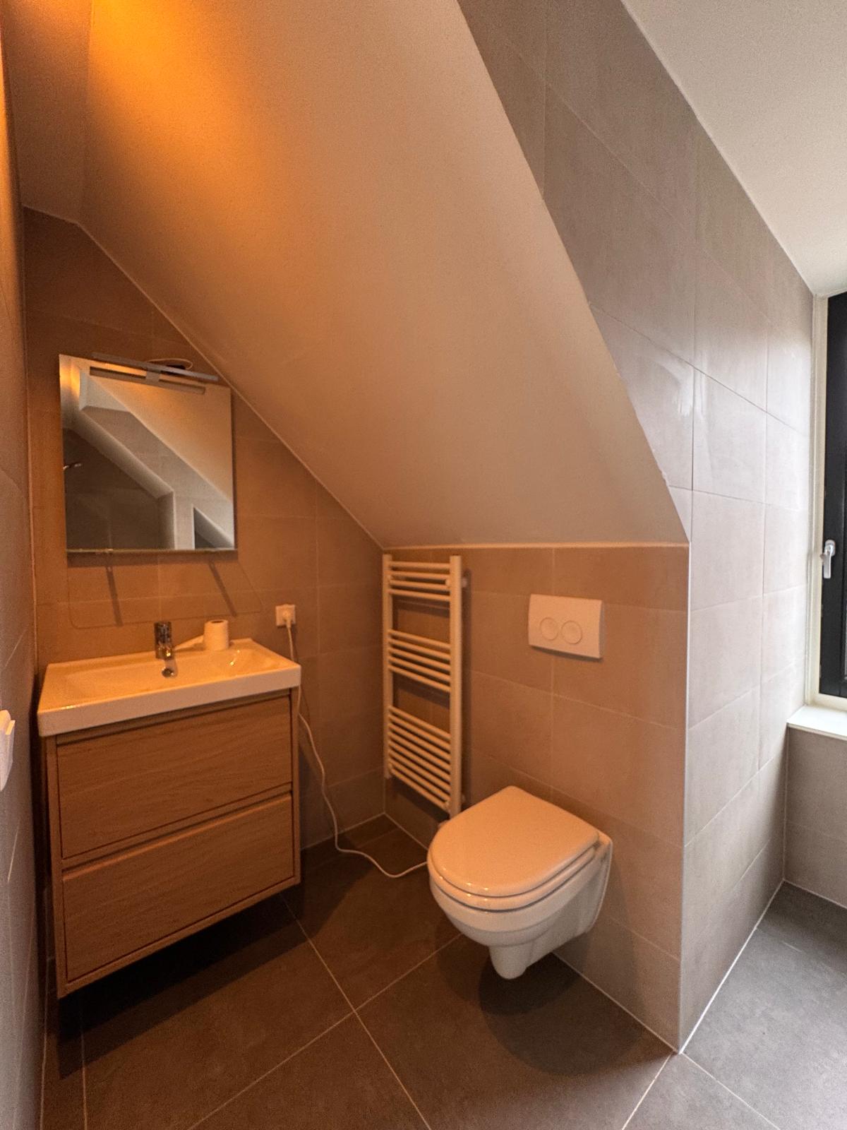 De ruime slaapkamer op de tweede verdieping is met een trap te bereiken en heeft een aparte badkamer. De badkamer is voorzien van een wastafel, douche, toilet en handdoek-radiator.
