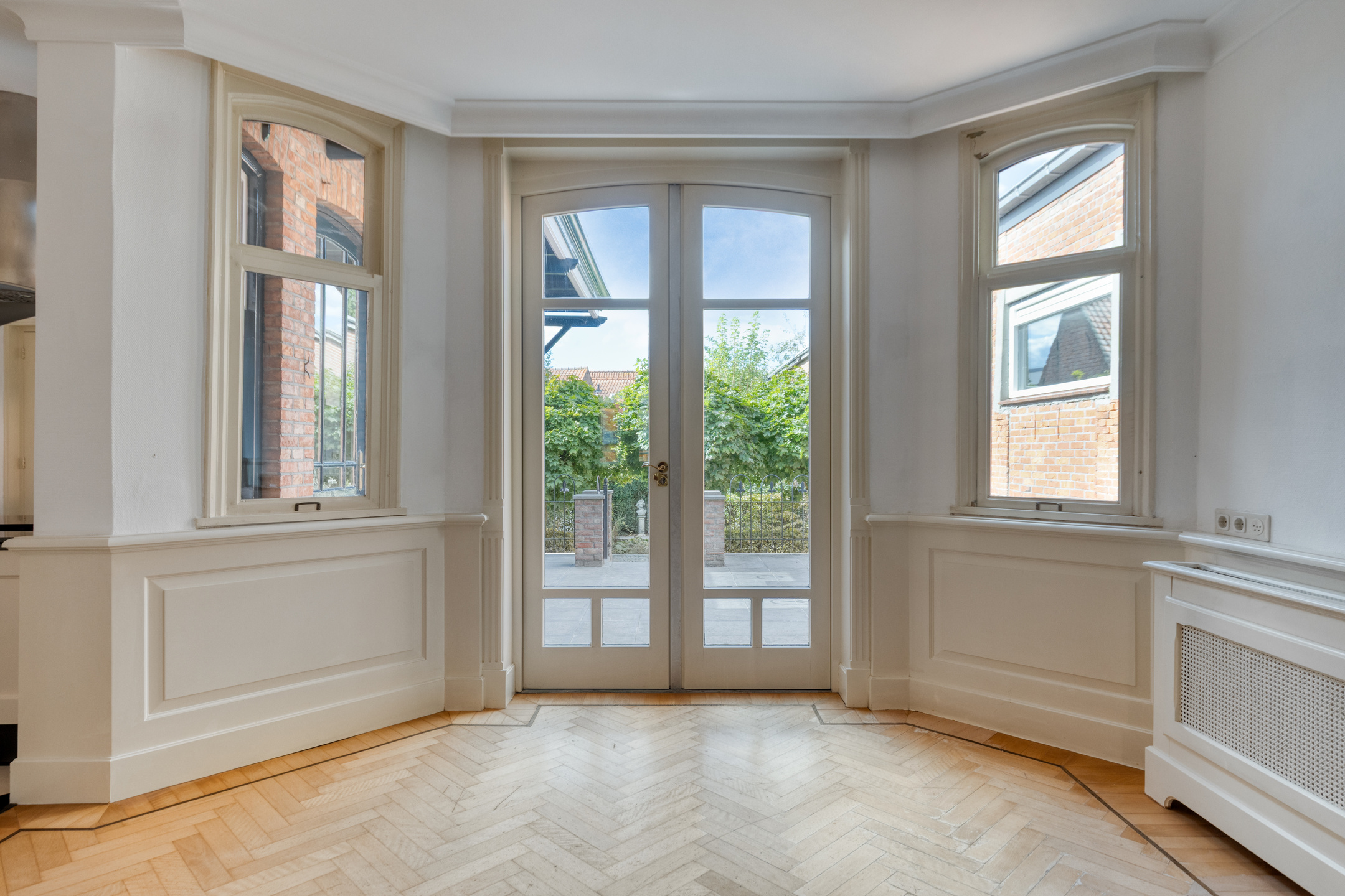 De sfeervolle woonkamer en suite is voorzien van een klassieke visgraat-parketvloer, originele marmeren schouw in Belgisch zwart en Doornik rood, die de open haard omgeeft met veilige liftdeur en voorzien is van een dubbelwandige metalotherm schoorsteenkaneel, met extra warmte via de begeleidende roosters in zowel kamer als badkamer op de eerste verdieping. De schuifdeuren met rijkelijk gedecoreerd geëtst glas verdelen de ruimte in een comfortabel zitgedeelte met erker, en een ruime eetkamer, voorzien van inbouwkasten aan beide zijden. De openslaande tuindeuren leiden naar een verhoogd tuinterras, waarop ook de keuken aansluit. Dit verhoogde tuinterras heeft een monumentaal overstek, karaktervol en praktisch, waaronder zich ook de twee buitenkasten bevinden. Warme stijlvolle vertrekken kortom, die u uitnodigen tot ontspannen binnen én buiten.