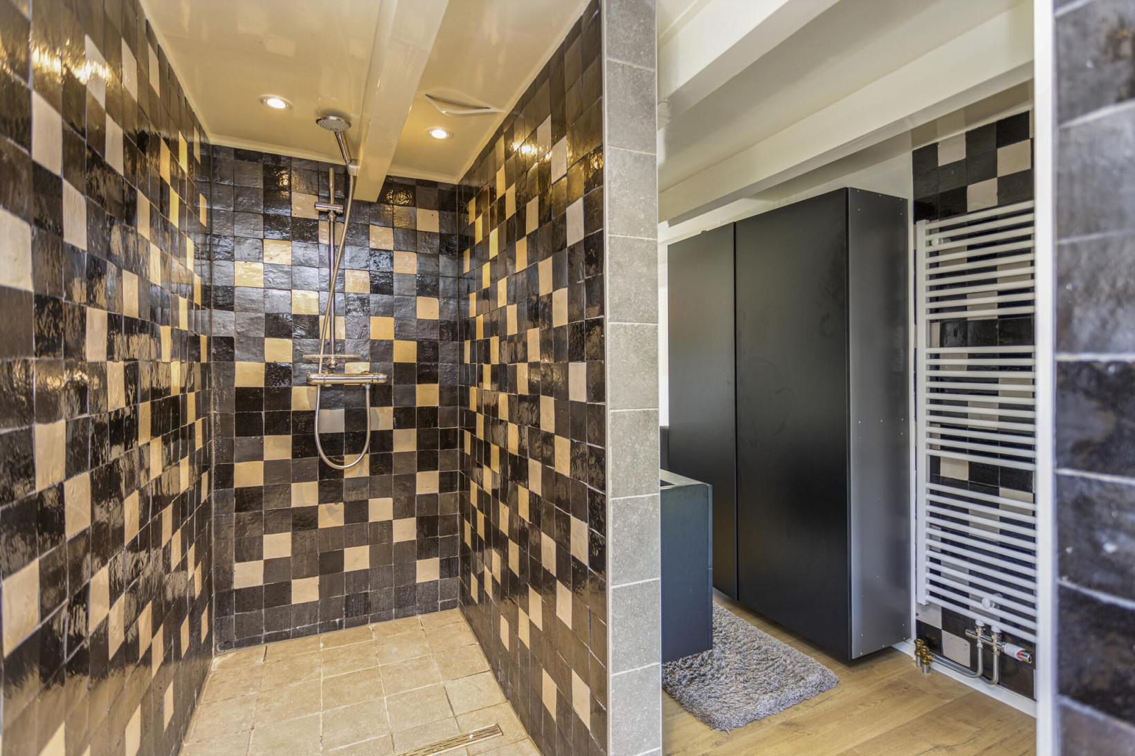 Hier bevindt zich een ruime slaapkamer met badkamer en-suite, voorzien van twee wastafels, toilet en een ruime inloopdouche.
