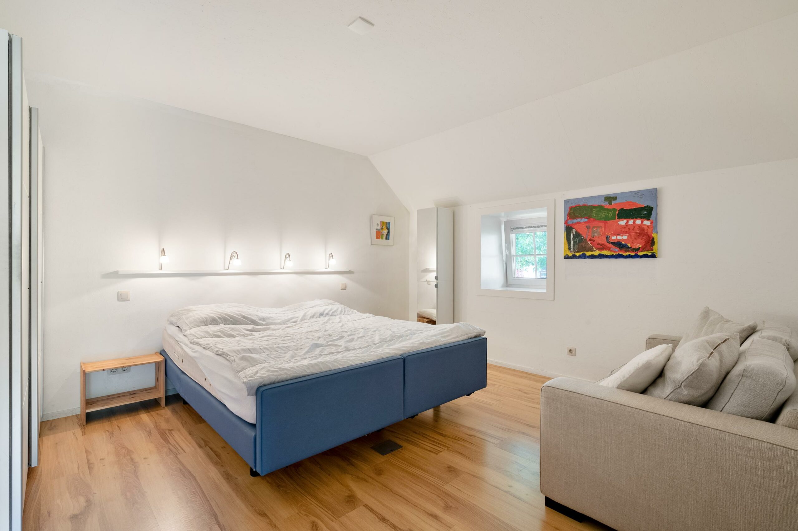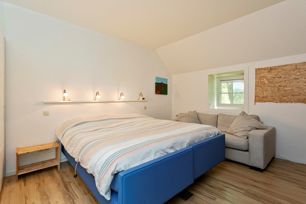 De keuken staat in open verbinding met de lichte woonkamer, voorzien van houtkachel en grote raampartijen met schuifpui naar het landschap. Vanuit de woonkamer bereikt u de tweede slaapkamer en badkamer met douche, toilet, wastafel en ligbad.
