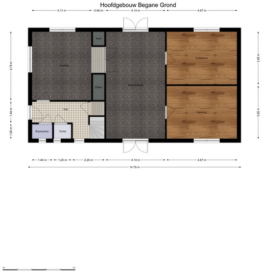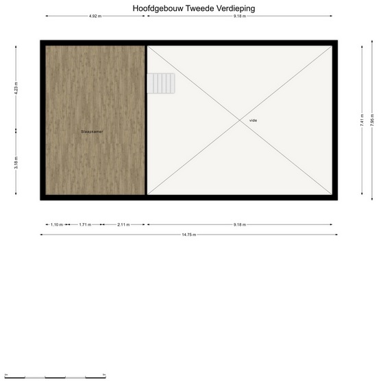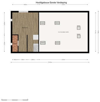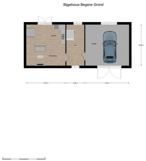 Het bijgebouw heeft een oppervlakte van circa 75 m² en beschikt over een inpandige garage van 28 m².